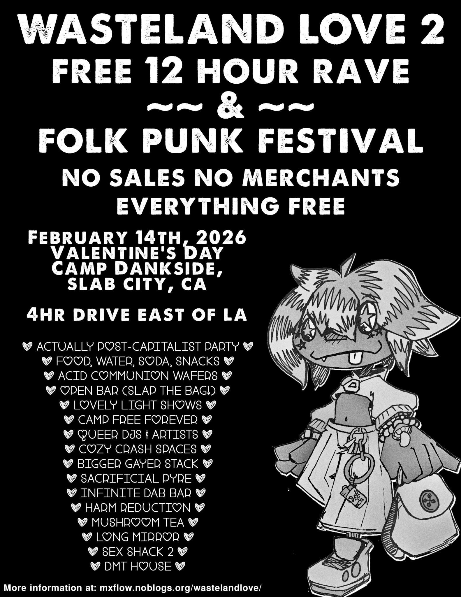 We are attempting to organize carpools from Los Angeles, if you’re driving out and have room in your car or need a ride, please reach out over Instagram or by email: mx.flow1312@proton.me. Busses go to Brawley regularly, infrequent bus stops in Niland. Slab City is a 30-60 minute walk from Niland with easy hitching! 4 Hour drive from Los Angeles, 5 hours from Phoenix, mostly highways, no off-roading required. Freight train yard nearby but very hard to hitch in from, easier to hop out (although a bus to Yuma is easier if you’re train riding anyway). Significant bike tour doable for the fit and experienced.
