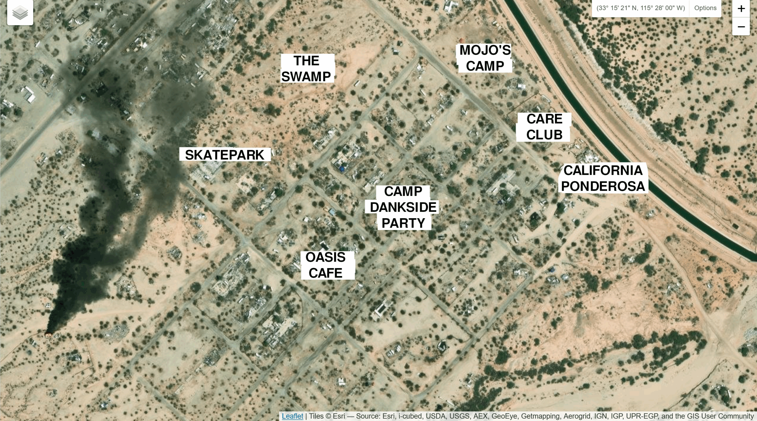 We are attempting to organize carpools from Los Angeles, if you’re driving out and have room in your car or need a ride, please reach out over Instagram or by email: mx.flow1312@proton.me. Busses go to Brawley regularly, infrequent bus stops in Niland. Slab City is a 30-60 minute walk from Niland with easy hitching! 4 Hour drive from Los Angeles, mostly highways, no off-roading required. Freight train yard nearby but very hard to hitch in from, easier to hop out (although a bus to Yuma is easier if you’re train riding anyway). Significant bike tour doable for the fit and experienced.